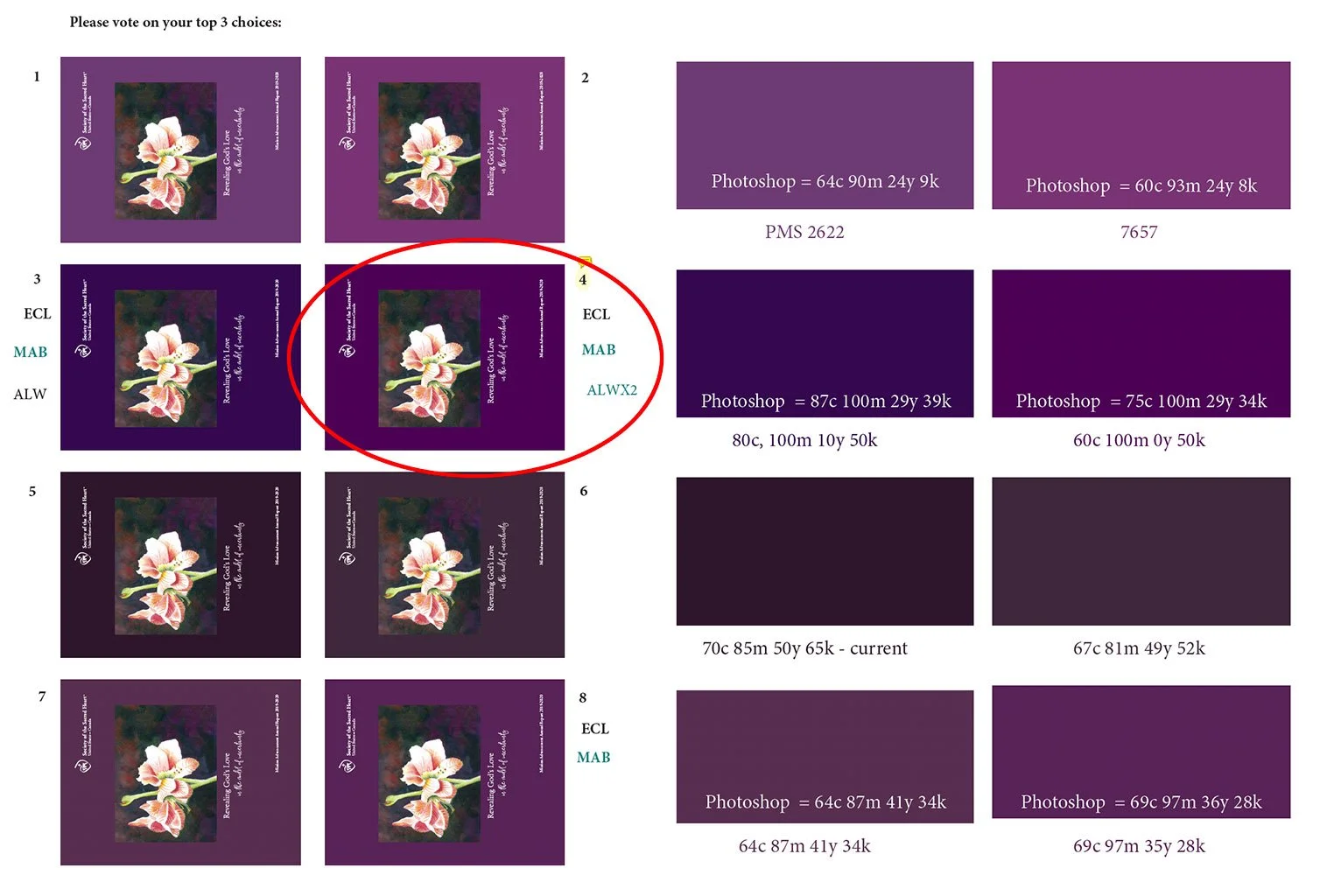 The client picked #4: 60 cyan, 100 magenta, 0 yellow and 50 black.